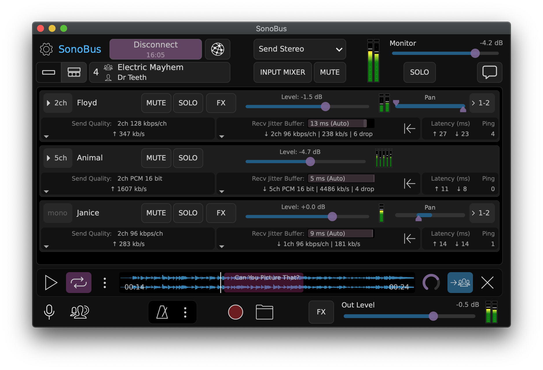 Recording. With one click you can record the entire session with many options for how you would like the tracks to be saved. The results I have gotten from Sonobus have been stunning, and it is simple to export the tracks and drop them into my DAW for further editing.