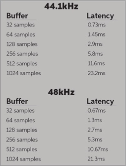 A Suboptimal Audio Buffer Size: Buffer size is the number of samples that your computer bites off at a time to process. You adjust this either in the software that drives your recording interface, or if your online collaboration software communicates with the interface, you can change it from there. This table to the left is an example of how buffer size and sample rate affects latency for a standard USB recording interface. Your mileage may vary. Thunderbolt interfaces are much faster than USB interfaces because the signal moves more quickly between your interface and your computer) and latency also varies by manufacturer. Your interface software will tell you the actual latency contribution when you change the buffer size.